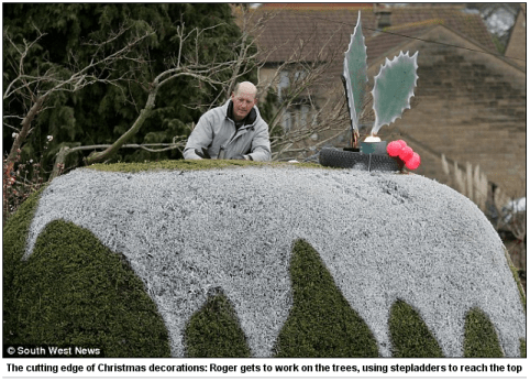 This is just soooo British, somehow. This is the fifth year that the Holleys of Yeovil, Somerset, have decorated the topiary globe in their front garden as a Christmas pudding.