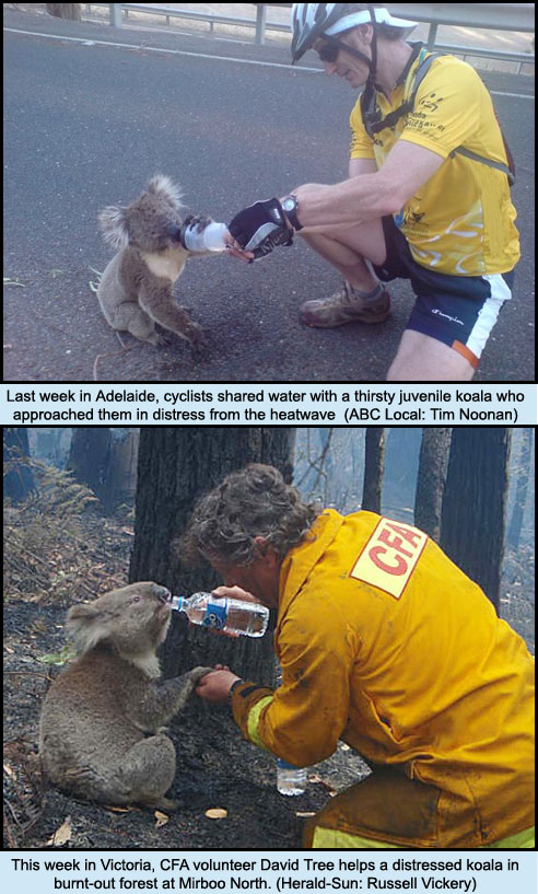 The adult koala in the Victorian fire zone is probably in shock, if not from actual burns then just from being in such a hostile environment and becoming dehydrated. I’m sure it’s in the hands of the wildlife rescue people now, and they will release it to the wild once it’s recovered and the fires are over.