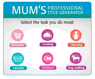 Image description: A box with header in teal blue with white writing: Mum’s Professional Title Generator. Underneath six coloured dots on a white background (pink, purple, orange, and teal blue dots) with a white picture on each dot – a shopping cart, a covered plate, a spray bottle, a laundry basket, a baby pacifier and a dog on a lead – with a one word description of each image underneath – groceries, cooking, cleaning, laundry, childcare, dog walking.