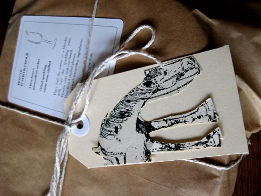 But next, actually make the present a little bit Christmassy. I had amazing luck at a discount shop where I found these Christmas cocktail recipe cards for $2 a deck. Honestly, they looked like nothing much at all, the outside of the pack gave nothing away about how truly pleasant they are inside. I’ve glued one of these cards on to each present, like so.