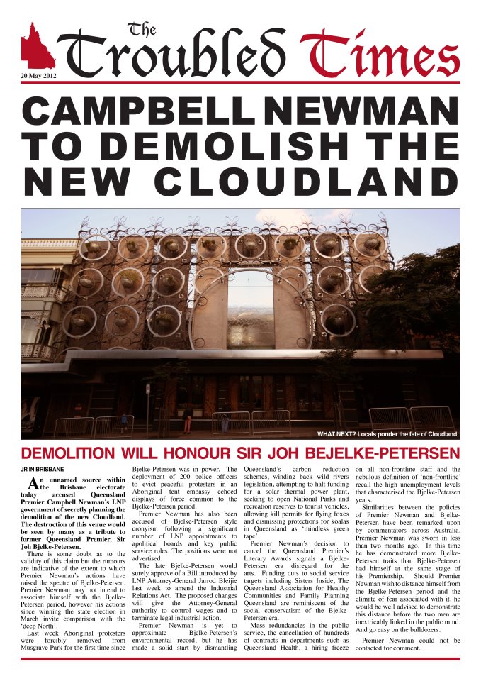 An unnamed source within the Brisbane electorate today accused Queensland Premier Campbell Newman’s LNP government of secretly planning the demolition of the new Cloudland. The destruction of this venue would be seen by many as a tribute to former Queensland Premier, Sir Joh Bjelke-Petersen.