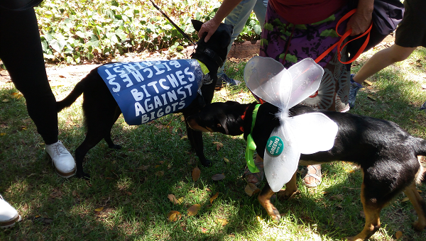 Two dogs attending the Womens March Sydney on Jan 21st, 2017. One is wearing a blue homemade coat that reads BITCHES AGAINST BIGOTS, the other dog is wearing fairy wings and a VOTE GREENS badge